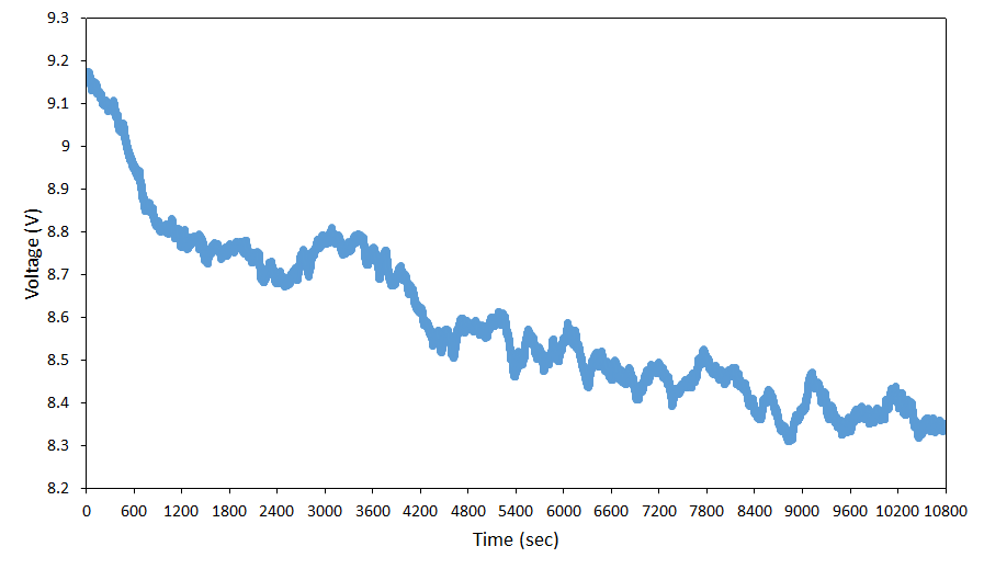 Fig. 6 presents evidence of the laser power drift when the distance between the laser and the photodetector was 5 cm and only the optical chopper was between them. After two hours of laser operation (7200 s), the fluctuations in laser intensity decreased over time but were still very intense; furthermore, there was no clear pattern. The results in Figure 6 were observed in different opportunities and could not be related to any other variable in the lab or the experiment.