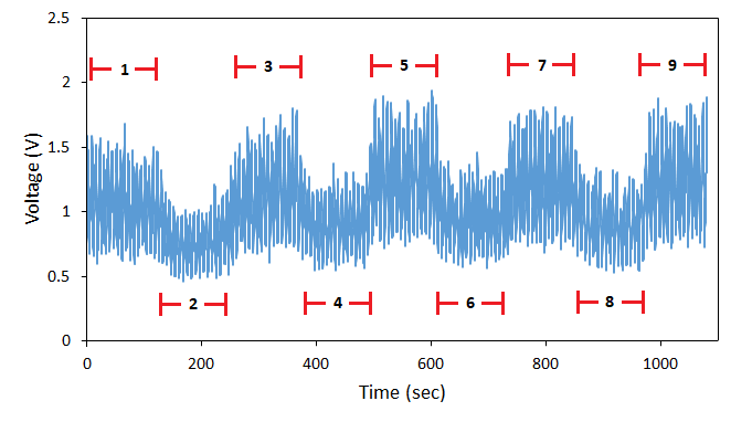 The uneven numbers (1, 3, 5, 7, and 9), i.e., zones with higher voltage, indicate periods of time when only nitrogen and catalyst were flowing. Even numbers (2, 4, 6, and 8) represent periods of time when the feed (1-hexene) was injected and N2 injection stopped, always in the presence of particles. While the high-frequency peaks and valleys in the signal were caused by the detection of particles passing through the laser signal, the average signal between each section also changed because of the laser drift. As some disruption can be expected when the flow is switched from N2 to the feed and vice-versa, the following procedure was applied to obtain an average laser signal in each zone. The time at which the highest value of intensity during N2 Injection i takes place was determined.