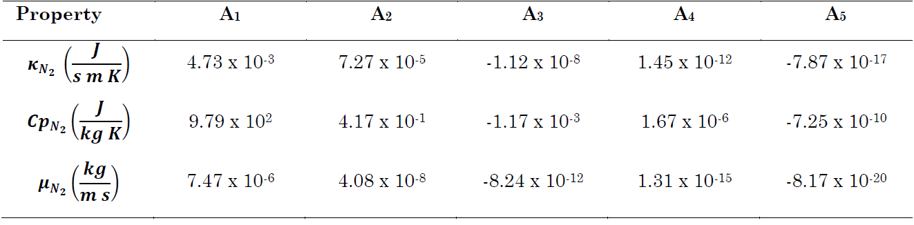 The CFD simulation required knowledge about properties related to heat transfer in the gas phase as well as the solution of the momentum equation. The thermal conductivity (κN2), specific heat (CpN2), and dynamic viscosity (μN2) of nitrogen were calculated using a polynomial approximation that was a function of the gas temperature (f(Tg)= A1 + A2·Tg + A3·Tg2 + A4·Tg3 + A5·Tg4). Table 1 summarizes the polynomial coefficients.
