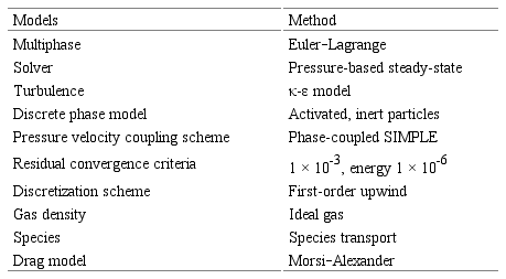 The CFD simulation was simplified by neglecting the interaction between the continuous (gas) and discrete (particle) phases. In this way, the solution of the dispersed phase considers the momentum and energy contribution from the continuous phase but not vice versa [33].