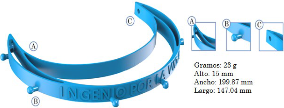 El diseño definitivo consiste en dos láminas curvadas, unidas entre sí, pero con diámetros diferentes, uno para garantizar el ajuste por medio del elástico a la cabeza y el otro para ajustar la lámina de PVC con bastante diferencia entre ellas para que el uso de accesorios en la cara, como tapabocas o gafas, no interfiera con el desempeño del dispositivo y, a la vez, garantizando mejores propiedades mecánicas (ver Fig. 1A). Adicionalmente, cuenta con unos pines alrededor de todo el perímetro para garantizar la cobertura total del rostro y una visión panorámica.