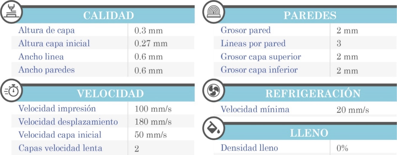 Las demás configuraciones se detallan en la Fig. 2 para un total aproximado de 1h de impresión, en distintas impresoras con características similares. La mayor parte de esa hora es empleada en la deposición del material en las paredes exteriores (aprox. 22 minutos).