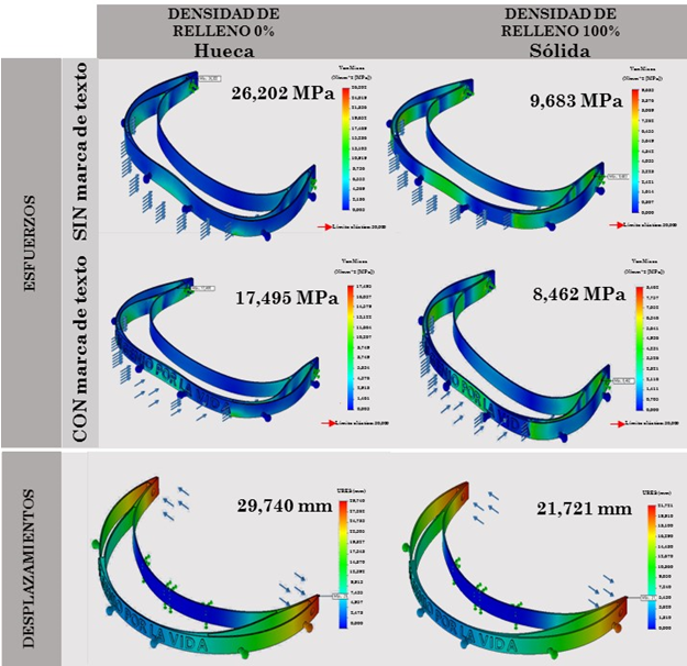 Al implementar una densidad de relleno de 0 % se tenía que verificar por simulación el desempeño mecánico de estas configuraciones. En consecuencia, se hizo un análisis por elementos finitos, utilizando una malla sólida de elementos cuadráticos de alto orden, basada en curvatura con un tamaño mínimo de elemento de 4.4 mm, con las propiedades del PLA, con un límite elástico igual a 30 N/mm., un coeficiente de Poisson de 0.394 y una densidad de 1.02 g/cm., aplicándole una carga de 20N para el primer caso de esfuerzos frontales y de 2.2 N para desplazamientos internos. En estos análisis se encontró que, al ser hueca, la diadema mostraba mayor flexibilidad frente a esfuerzos frontales y desplazamientos laterales, resaltando el papel de la marca en el frente para mejorar su desempeño (ver Fig. 3).