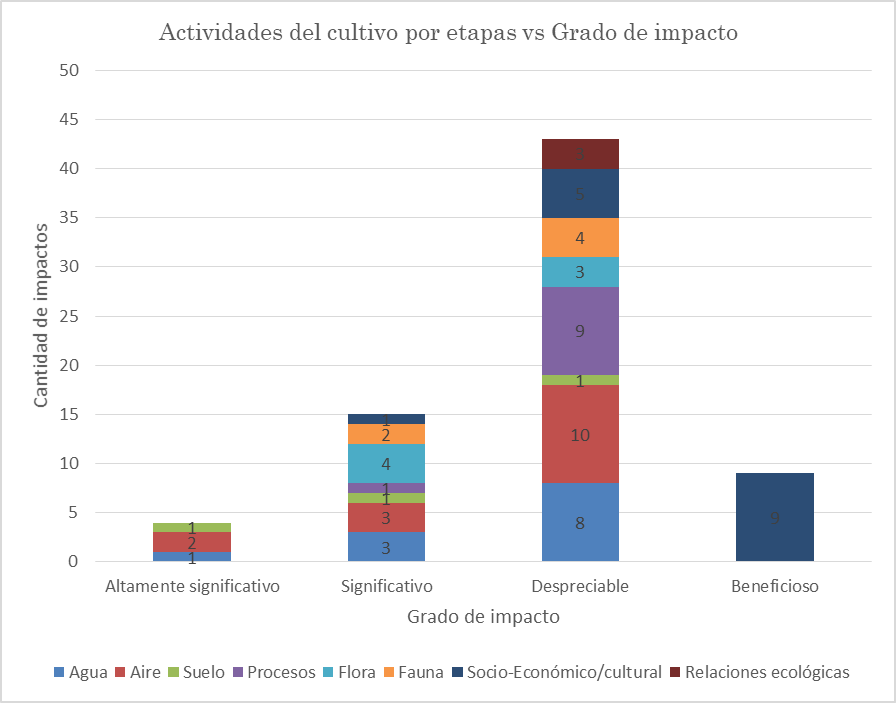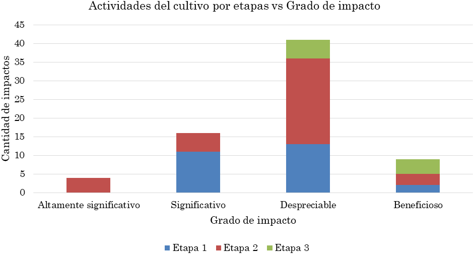 En el trabajo desarrollado se analizaron 11 actividades y 17 factores, y se obtuvieron 71 interacciones, las cuales se ponderaron y clasificaron según su impacto. De tal forma se determinaron 4 impactos altamente significativos, 15 impactos significativos, 43 despreciables y 9 beneficiosos. En la Fig. 1, se puede observar con detalle cada una de las principales actividades del cultivo de la pitahaya con la cantidad y grado de impacto que genera cada una de ellas.