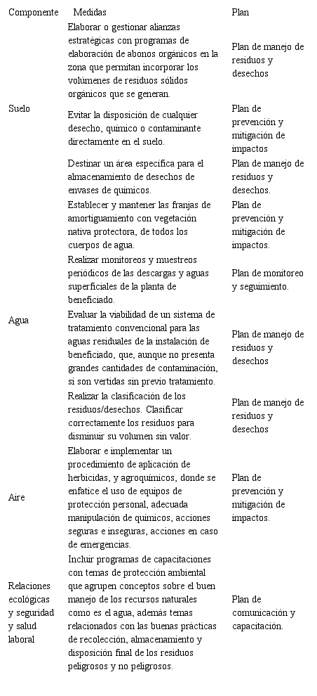 Para el suelo y la generación de residuos tanto peligrosos como comunes se implementará un sistema de recolección y de igual forma de clasificación de los mismos para disminuir su volumen antes de su disposición final en el relleno sanitario, medida apoyada también por [30], los residuos sólidos y líquidos de las instalaciones de beneficiado se manejarán por separado de los residuos de la cosecha y se proporcionarán instalaciones adecuadas de agua potable y lavado a ubicaciones. Además, en la zona existen varios programas de aprovechamiento de abonos orgánicos, y la producción de compostaje con los residuos puede generar buenos rendimientos productivos [31], lo que generaría ingresos económicos para los pobladores de la comunidad.