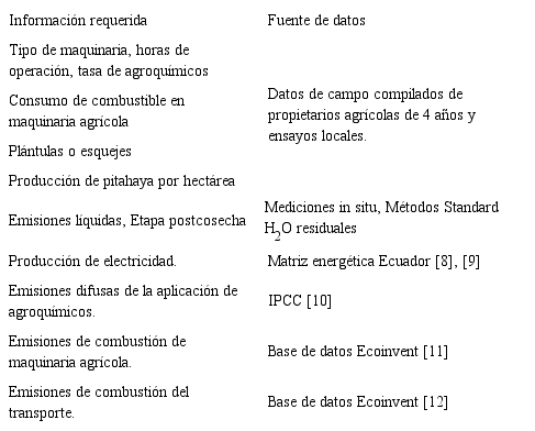 Para conocer las entradas y salidas de las diferentes etapas del proceso productivo se realizaron entrevistas al propietario y mediciones de los flujos durante un ciclo de cosecha. En esta sección se consideraron todos los insumos empleados por etapas, hasta la salida de la fruta lista para la comercialización.