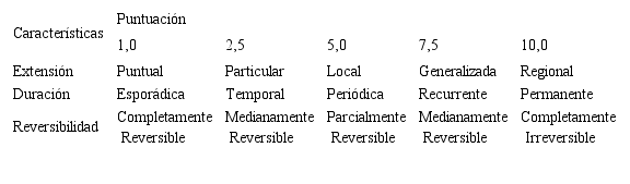 El término (W) significa factor de ponderación, en este caso para los tres impactos: extensión, duración y reversibilidad. El peso de ponderación empleado fue: peso extensión (We) de 0,30, mientras el peso de la duración (Wd) y de la reversibilidad (Wr) fue de 0,35.