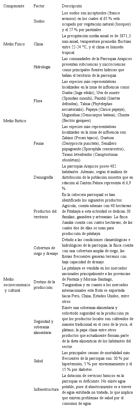 Los principales hallazgos determinados en la línea base de la zona de cultivos de pitahaya de tipo Parroquia Arapicos, se presentan en la Tabla 4: