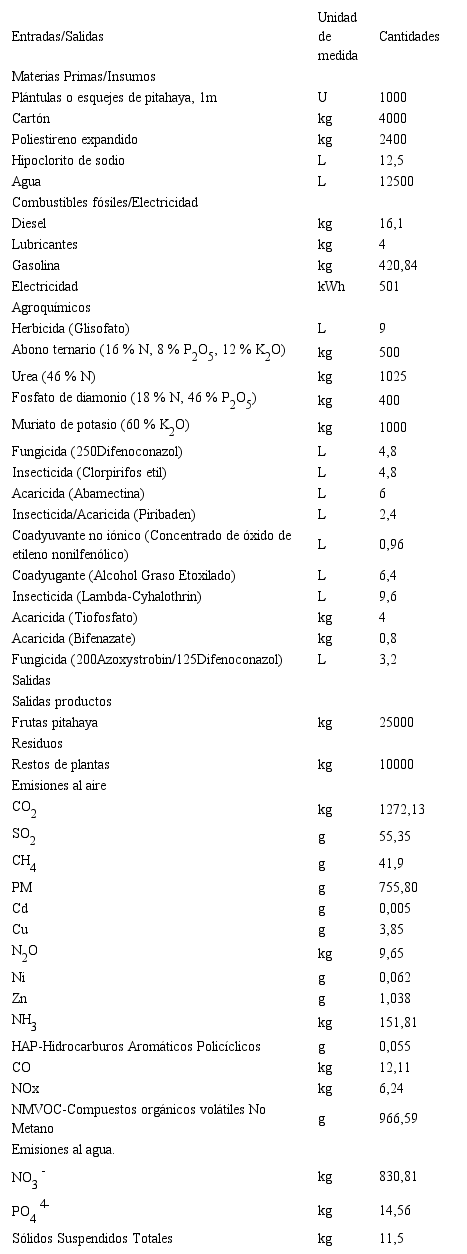 En los criterios analizados del balance de masa del proceso productivo, las principales entradas son los insumos agroquímicos, plántulas, combustible, energéticos y agua necesaria. Mientras, en las salidas, las cantidades más representativas son cantidades de fruta lista para la comercialización, envases vacíos de agroquímicos, residuos sólidos, restos de poda de las cosechas, aguas residuales de las instalaciones de beneficiado y las emisiones gaseosas estimadas a partir del consumo de combustible y del uso de fertilizantes, entre otros. La Tabla 5. muestra, las principales corrientes de entradas y salidas de una hectárea de 4 años de sembrada.