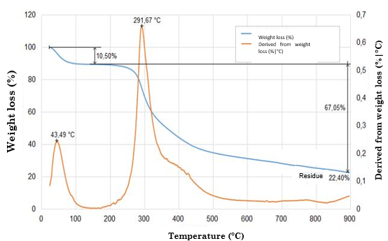 Prior to this analysis, all samples were stored in a container with silica gel to eliminate the effect of water. The thermal properties of 2 mg of each sample were characterized using a thermogravimetric analyzer under a nitrogen atmosphere with a gas flow of 20–100 mL/min- Then, they were heated at temperature ranges of 25–1800 ° C and at a heating rate of 10 °C/min. Measurements were determined based on temperature increase in order to evaluate the thermal degradation behavior of the samples.