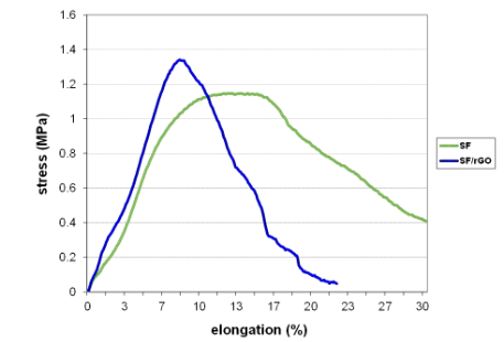 Silk fibroin membranes containing 0.5 % wt of rGO treated with methanol showed higher values of percent strain, and those containing 3 % wt reported an improved maximum fracture strength.