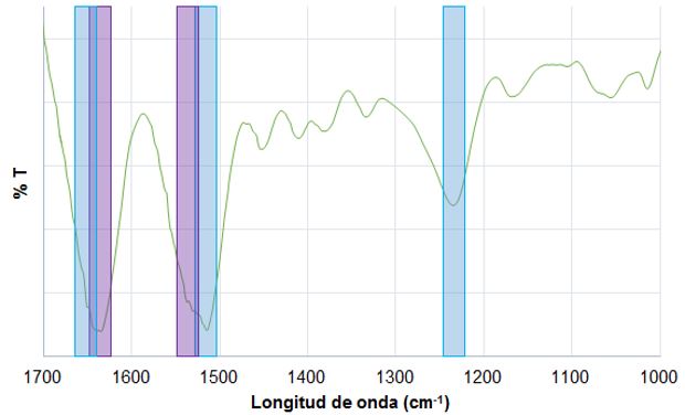 The α-helix showed strong absorption bands at 1656 cm-1 (amide I) (C=O stretching vibrations), 1540 cm-1 (amide II) (secondary N–H bending), and 1230 cm-1 (amide III) (C.N stretching vibrations and N.H bending). The estimated percentage of b-sheets was 29.28 %. Both crystalline and amorphous structures coexisted in different proportions in the silk fibroin samples, and a greater presence of β-sheet structures in the nanofibers was observed [43], [57], [65]–[68]. The absorption bands moved slightly after treatment with methanol or ethanol to 1626 cm-1 (amide I), 1523 cm-1 (amide II), and 1260 cm-1 (amide III), which indicates that the structure changed to crystalline b-sheet monoclinic antiparallel chains pleated in the electrospun nanofibers [50], [54], [63].