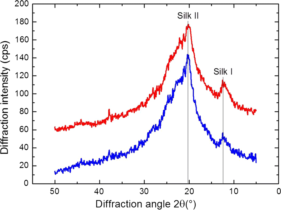 The crystal structure of silk fibroin nanofibers was studied using an X-ray diffractometer with a LynxEye detector [67], a CuKα radiation source (wavelength λ = 0.1541 nm) operating at 40kV and 40 mA over diffraction angles measured from 2θ = 0–40 °, and an X'celerator counter [49], [69] at a scanning rate of 0.015 °/s [67], 0.040 °/s [49], 0.048 °/s [70]. These parameters serve to obtain an X-ray diffractogram [71].The crystallinity of the silk fibroin nanofibers and the variation in the percentage of b-sheet content corresponding to the crystal structure due to enzymatic degradation were determined [49]. The database of the International Centre for Diffraction Data (ICDD) was employed to identify the composition of the phase [64].