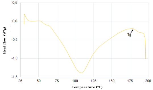 The DSC thermogram showed three peaks. The first one corresponding to the vitreous transition temperature occurred at 80–100 °C. The second one (melting temperature) at 180 °C was due to the start of the crystallization process within the silk fibroin. The third one at 278 °C was attributed to the beginning of the thermal degradation of the silk fibroin [30].