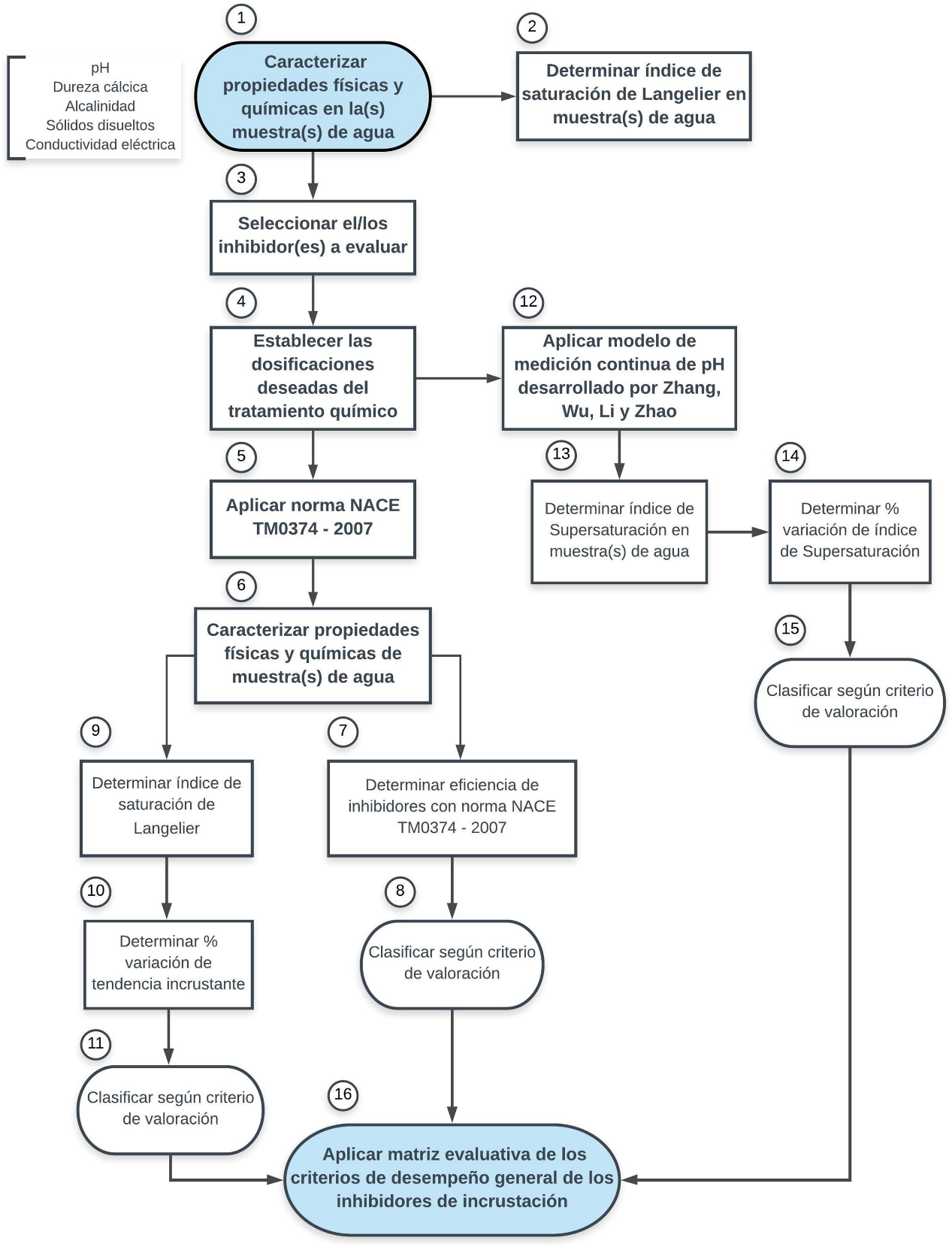 Con la finalidad de ratificar o permitir sugerir modificaciones a la secuencia planteada para la metodología ya señalada, los inhibidores Q1, Q2 y Q3 fueron evaluados tomando en cuenta la variación de las propiedades físicas y químicas de las muestras de agua formuladas, en cada una de las etapas que conforman esta nueva herramienta, la cual se encuentra especificada en el diagrama de flujo ilustrado en la Fig. 1 y que guió la sucesión de trabajo de esta investigación.