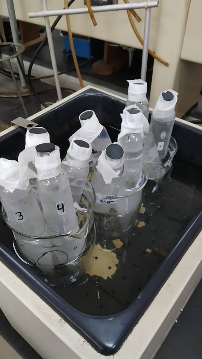 Posteriormente, se adicionaron las dosis previamente establecidas (55, 100 y 300 ppm) de los inhibidores a ser evaluados, dejando una celda sin dosificación, a la cual se le denominó como blanco. Las celdas fueron dispuestas en un baño termostático marca Thermo ScientificTM, modelo 18202 a 71 ± 1 ºC durante 24 horas, tal como se visualiza en la Fig. 2. Posterior al tiempo establecido, fueron extraídas del mismo, evitando ser agitadas, y se dejaron reposar hasta la temperatura ambiente, determinando nuevamente la dureza cálcica de las muestras analizadas y con ello el porcentaje de eficiencia de los inhibidores durante esta etapa a través de (7).