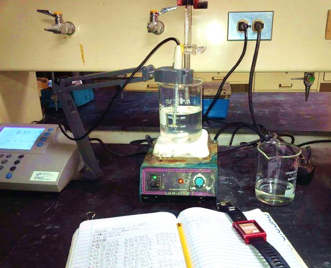 El montaje experimental (Fig. 3) estuvo comprendido por una plancha de calentamiento (hot plate) marca Magnestir Lab-Line, una bureta de 250 mL marca Cole Parmer, un beaker de 500 mL con agitador magnético y un pHmetro digital marca Denver Instrument, modelo 220.