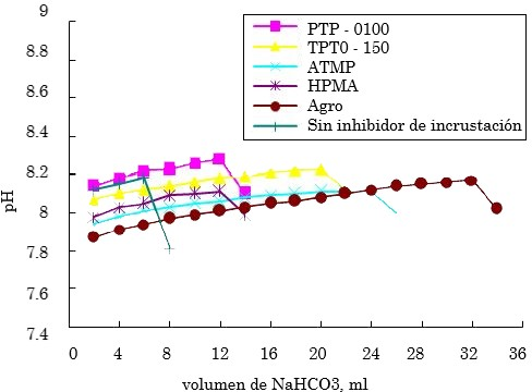 La prueba consistió en tomar una cantidad en mL de solución de cloruro de calcio (CaCl2) en concentraciones de 6,66; 12,66 y 4,66 g/L, correspondientes a las tres muestras respectivas ya mencionadas; obteniéndose estas concentraciones a partir de una relación entre la cantidad de sales utilizada en los métodos anteriores y la empleada en el modelo de medición de pH continúo desarrollado por Zhang, Wu, Li y Zhao [31]. Cada una de ellas fue mezclada con una cantidad de agua destilada conforme con la proporción de CaCl2 añadida y cada una de las dosis ya estipuladas de los inhibidores elegidos para esta evaluación. Luego se tituló con bicarbonato de sodio (NaHCO3) en concentraciones de 5 y 2,28 g/L, agregando 2 mL cada 60 segundos.