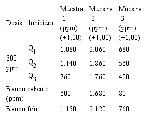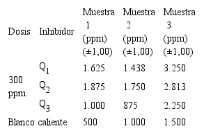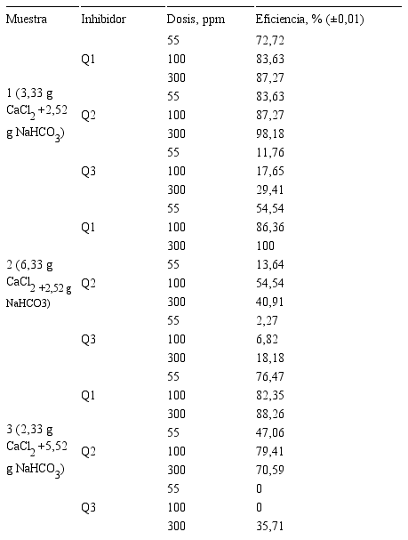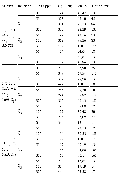 Reyes et al. [15] evaluaron el comportamiento del inhibidor Q3 y evidenciaron la elevada dureza cálcica que presenta el mismo; dicha afirmación se confirma con los resultados obtenidos en las distintas muestras que lo describen como un inhibidor regular y deficiente al presentar porcentajes de variación bajos y negativos.