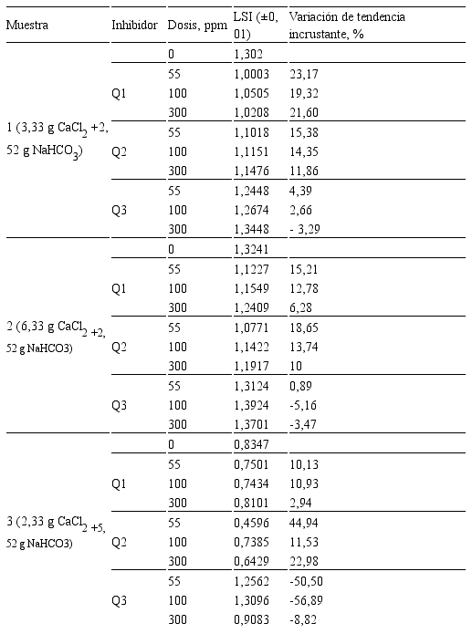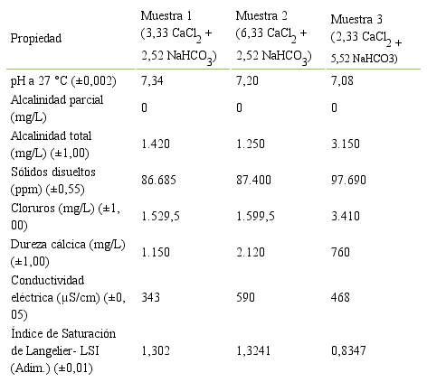 Al evaluar la metodología empleando tres muestras de aguas sintéticas y tres productos inhibidores, con características distintas, el estudio arrojó que la totalidad de las muestras de agua poseían tendencia a formar incrustaciones de carbonato de calcio de acuerdo con el índice de saturación de Langelier (1,302; 1,3241 y 0,8347) y con su condición alcalina debido a los valores de pH obtenidos.