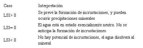 Para este método se definen como incrustantes, corrosivos o neutros a las muestras de aguas tal y como se establece en el método de Langelier [38] (Tabla 1).