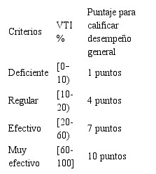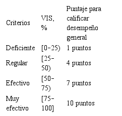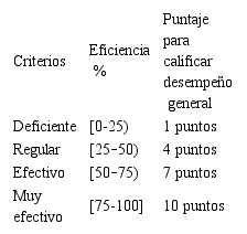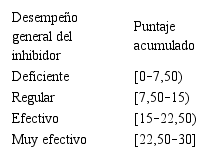 ⑧ Siendo este método capaz de arrojar una eficiencia directa, se consideró el resultado obtenido y se interpretó a través de los siguientes criterios (Tabla 2), asignándose un puntaje a los resultados alcanzados que al final permitieron calificar el desempeño general del inhibidor en la matriz evaluativa.