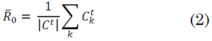 donde S0 es la cantidad inicial de susceptibles en el momento de la introducción de los primeros infectados, y St la cantidad de susceptibles en el momento t. El segundo estimado se obtiene a escala individual, calculado directamente mediante rastreo a los agentes, a sus contactos y contagios individualmente a lo largo de la línea de tiempo de la epidemia, y luego tomando el promedio, como se observa en (2):