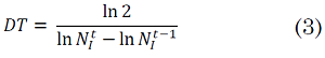 1) El tiempo de duplicación calculado según [19] , como se observa en (3):