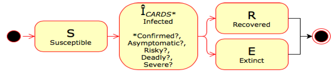 La representación esquemática del modelo extendido resultante, que llamamos SȊRECARDS, se muestra en la Fig. 1. Nótese que no todas estas condiciones son mutuamente excluyentes, ya que representan etapas acumuladas del estado Ȋ, que evolucionan de la manera que se explica más adelante.