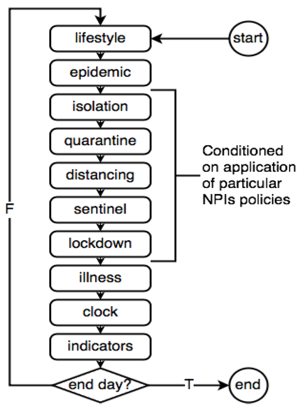 epidemic: aquí se simula la propagación de la epidemia, con transmisiones que se producen en proporción a la proximidad entre infecciosos y susceptibles y la probabilidad de contagio. Si ocurre una transmisión, el nuevo caso se caracteriza inicialmente como no confirmado, no testado, no grave y no mortal. La condición de asintomático y/o riesgoso de un nuevo caso se define de acuerdo con las probabilidades correspondientes establecidas como parámetros del modelo.