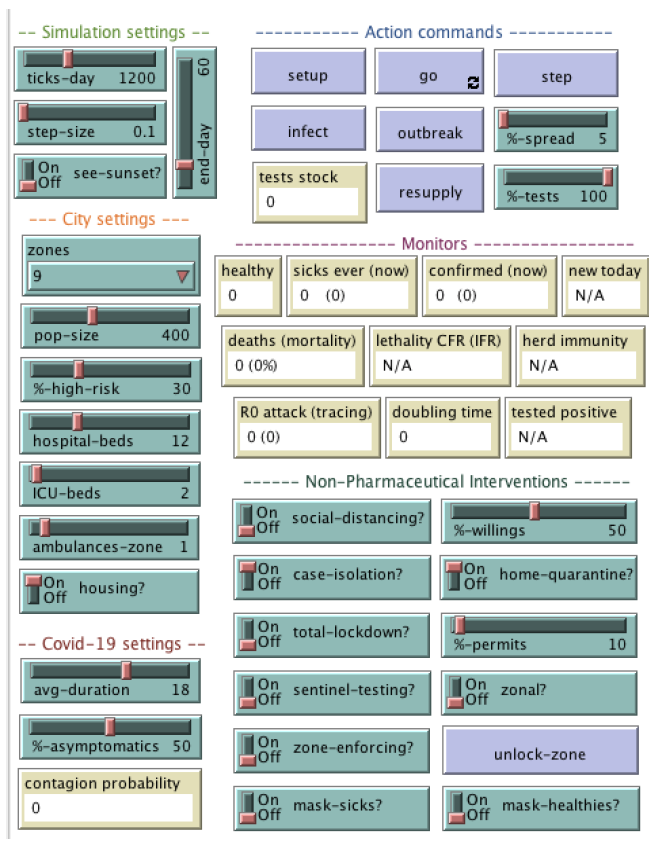 La herramienta de simulación se implementó en el lenguaje NetLogo v.6.1 (13 de mayo de 2019) y está disponible gratuitamente para experimentación en el sitio web de ModelingCommons (ver http://modelingcommons.org/browse/one_model/6374). NetLogo es una plataforma de software ampliamente utilizada para modelado ABM, que integra además del lenguaje, un área de vista gráfica y un banco de pruebas para el diseño experimental [20]. El simulador implementa los NPI, el modelo SȊRECARDS epidémico y las reglas de comportamiento del agente descritas anteriormente.