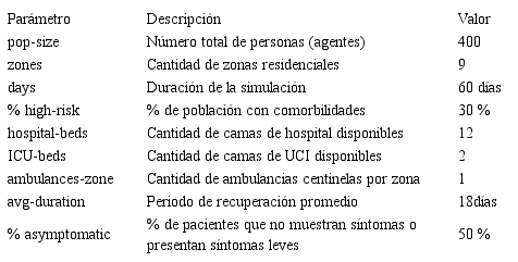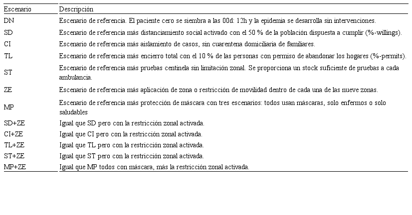 La descripción de estos escenarios se da en la Tabla 1. Los parámetros generales, de ciudad y COVID-19 utilizados en todas las simulaciones se describen en la Tabla 2. Para cada escenario, se supone que la epidemia comienza con un "paciente cero" sembrado al azar en cualquier zona de la ciudad, a las 0d: 12h después del inicio de la simulación. La aplicación de las políticas NPI configuradas comienza a las 04d: 00h.