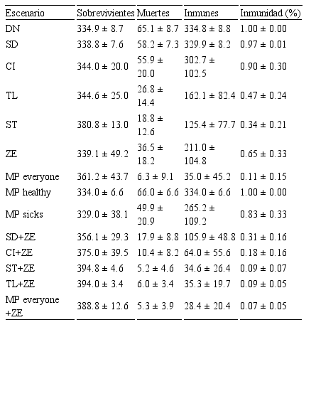 Para cada escenario realizamos un experimento que consta de 30 repeticiones de ejecución del modelo de simulación con una duración de 60 días. Recopilamos los resultados del recuento de agentes sanos, muertes e índice de inmunidad, así como algunos indicadores epidémicos obtenidos al final del periodo de la simulación.