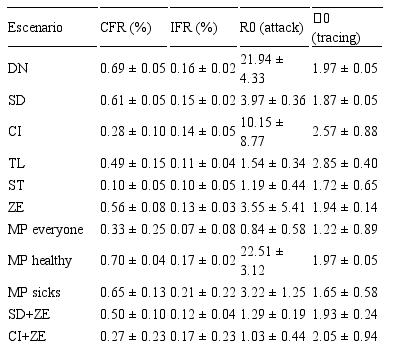 Lo anterior corrobora nuevamente la observación respecto a la priorización que se le debe dar a las intervenciones ST u MP. Por otra parte, se observa que las dos medidas del número de reproducción difieren, particularmente en el escenario DN (R0=21.94, 0=1.97), como mencionamos anteriormente [18]. En vista de estos resultados, creemos que el enfoque de rastreo 0 provee una estimación más realista en simulaciones ABM.