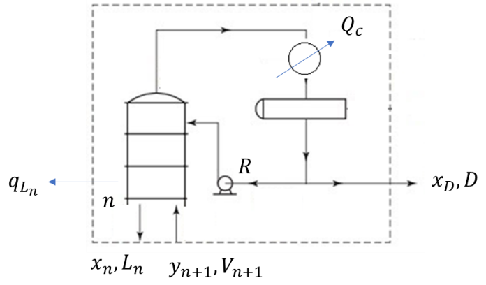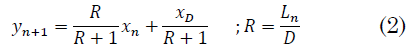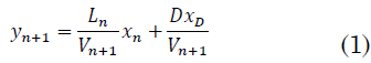 Donde Ln es el flujo de la corriente líquida que sale del plato n, xn es la composición del líquido en el plato n, D es la corriente del producto destilado, xD la composición del destilado, y Vn+1 es la corriente de vapor proveniente del plato n+1. Reorganizando esta ecuación en términos de la razón de reflujo interno (R) se relacionan las composiciones de dos corrientes en contacto (2):