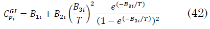 Existe una variedad de modelos para las capacidades caloríficas de gas ideal (CGIpi). Se prefiere el uso del modelo de Bures [12], ya que este utiliza tan solo tres parámetros y además es adecuado para extrapolar a altas y bajas temperaturas, donde las constantes B1i, B2i y B3i son características de cada sustancia (42):