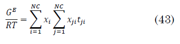 Para modelar el equilibrio L-V, se usó la ley de Raoult modificada y para ello es necesario un modelo para calcular los coeficientes de actividad (gi). Se utilizó la ecuación NRTL, la cual tiene ventajas sobre otros modelos, este modelo se fundamenta en el uso de las llamadas “Composiciones Locales”, las cuales están influenciadas por las diferencias de tamaño molecular y las fuerzas intermoleculares [19]. Las composiciones locales generalmente son diferentes a las composiciones globales o medibles del sistema. La ecuación NRTL para la energía libre de Gibbs en exceso se representa en (43):