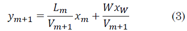 Planteando un balance total de materia en la sección de empobrecimiento, del componente A y despejando la composición del vapor en el plato m+1 (Vm+1) se obtiene (3):