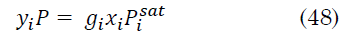 En este caso, como se trabaja con un modelo de actividad y no una ecuación de estado, el criterio de equilibrio se trasladará a la ley de Raoult modificada, dicha ecuación involucra el coeficiente de actividad gi. Este método es conocido como el modelo de equilibrio en sistemas ideales (48), donde el sistema se puede considerar a presiones lo suficientemente bajas para aceptar la definición de idealidad en el vapor y toma en cuenta que los componentes en la fase líquida son muy similares y no interactúan de forma apreciable entre sí [20].