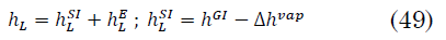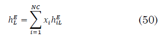 Para el cálculo de la entalpía es necesario reconocer un estado de referencia de sustancias elementales (C, N, O) a 25°C, 101.325 kPa y por medio de las capacidades caloríficas de Bures, la ecuación de presión de vapor de Wagner y el modelo NRTL se obtiene la entalpía de la mezcla líquida (hL). Para la mezcla en vapor se asume un vapor ideal (49) a (52).