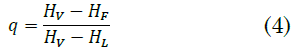 Donde HV es la entalpía de la alimentación a las condiciones del punto de rocío, HL es la entalpía de la alimentación a las condiciones del punto de ebullición (punto de burbuja), y HF es la entalpía de la alimentación a las condiciones de entrada. Si la mezcla entra en su punto de ebullición el valor de q es 1 y si la mezcla entra en su punto de rocío el valor de q será 0. Para valores de q>1 es una mezcla líquida en frío y para valores <0 es un vapor sobrecalentado. También se puede considerar a q como el número de moles de líquido saturado producido en el plato de alimentación por cada mol de alimentación que penetra a la torre en la corriente de alimentación F. Con base en la definición de q, se pueden establecer (5) y (6) que son la relación entre los flujos por encima y por debajo de la entrada de alimentación, respectivamente.
