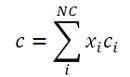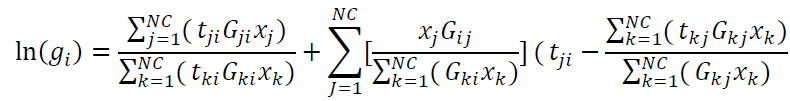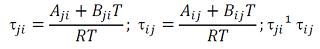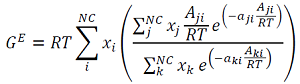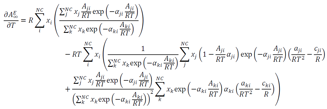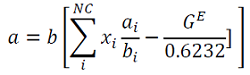 Utilizando el modelo de actividad NRTL el cálculo de los parámetros a (18), b (19) y c (20) de la mezcla con esta regla se plantea una expresión para GE (21) y en los factores Aij que corresponden a una matriz de interacciones moleculares de los compuestos consigo mismos y con los demás compuestos (22).