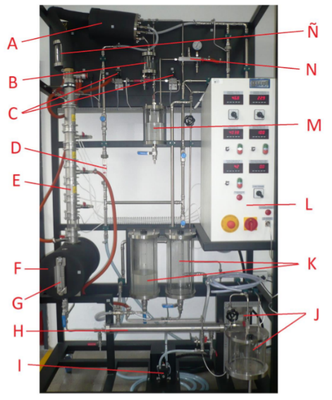 En la Fig. 1 se presenta una fotografía de la torre de destilación continua de platos perforados marca GUNT con las partes más importantes (A: Condensador total, B: Recipiente receptor del destilado (Tanque IV), C: Válvulas magnéticas para relación de reflujo (L/D), la primera válvula de izquierda a derecha corresponde a la válvula 10 y la segunda corresponde a la válvula 7, D: Rotámetro para agua de entrada al condensador, E: Columna de platos, F: Rehervidor, G: Medidor de nivel del rehervidor, H: Intercambiador de calor, I: Bomba peristáltica para alimentar la torre, J: Tanque de almacenamiento de las colas (Tanques VIII A y B), K: Tanque depósito de alimentación (Tanque VI A y B), L: Panel de control, M: Tanque de producto (Tanque V), N: Sistema para vacío de la columna, Ñ: Tanque para solvente extractor.