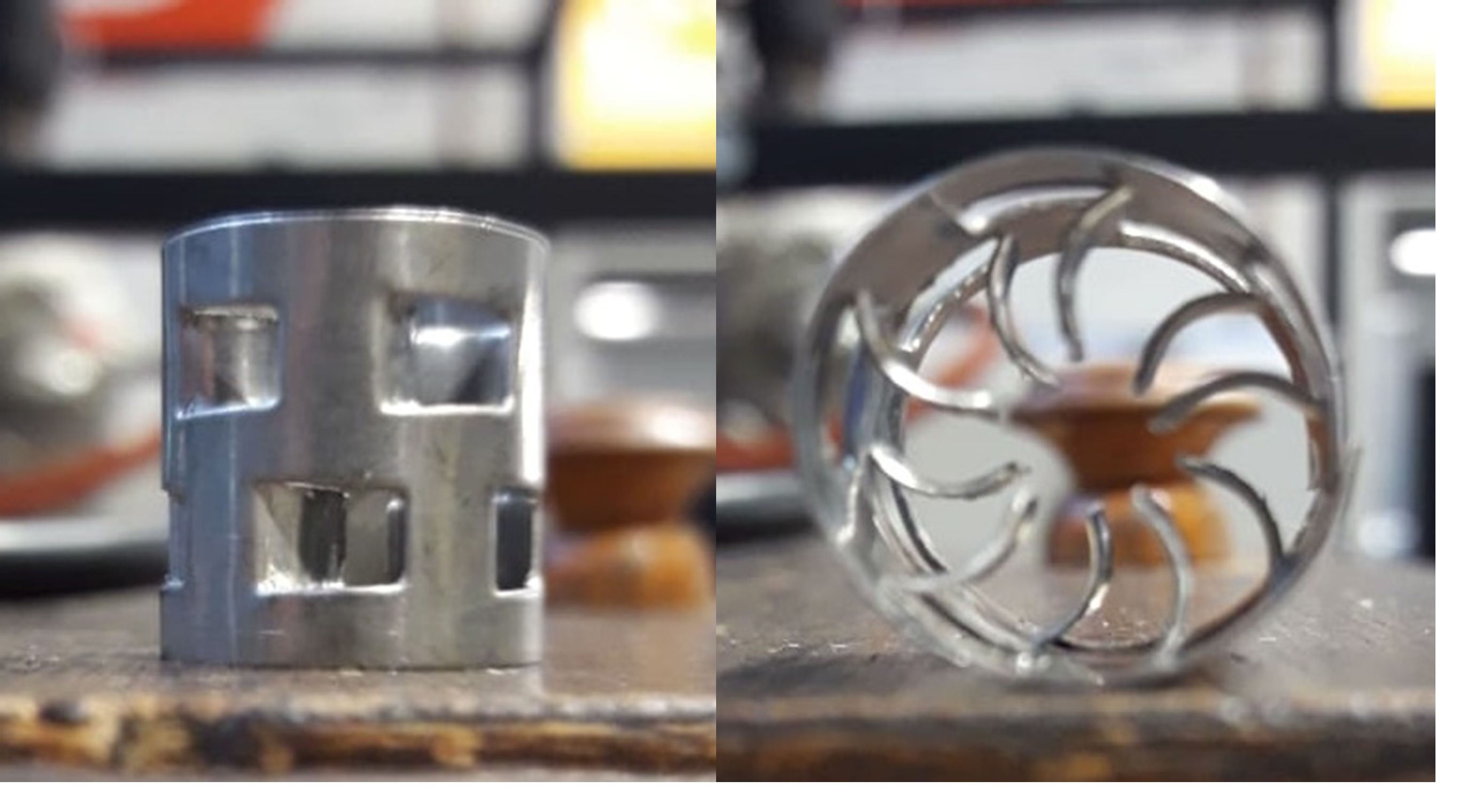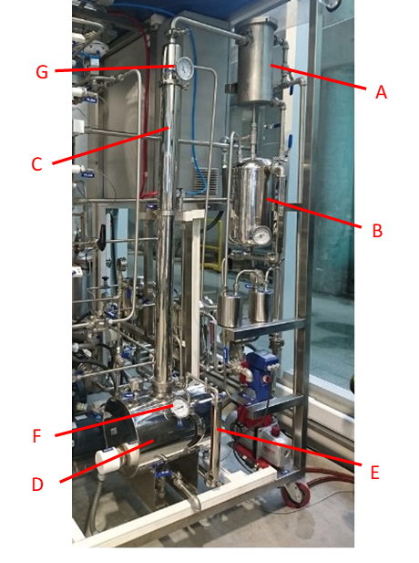 En la Fig. 2 se presenta una fotografía de la torre empacada de destilación discontinua (TDD) con las partes más importantes (A: Condensador total, B: Recipiente receptor del destilado, C: Columna empaca, D: Tanque rehervidor, E: Medidor de nivel del rehervidor, F: Indicador de temperatura rehervidor, G: Indicador de temperatura torre). La planta tiene la opción de operar la torre a vacío y con reflujo, control de potencia o temperatura en el rehervidor. En la Fig. 3 se presenta una fotografía de los anillos tipo pall de acero inoxidable de 1”.