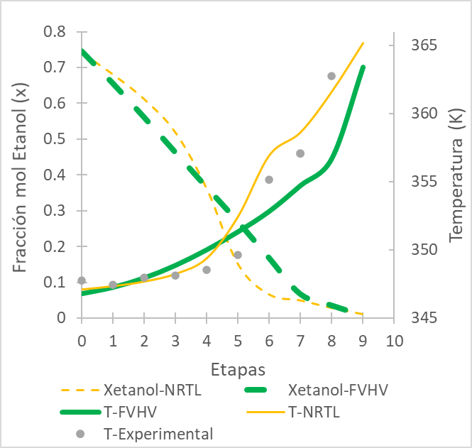 Los valores de temperatura en cada etapa y composición del destilado se registraron cada 5 min después de alcanzadas las condiciones de estado estacionario. En la Fig. 7 se presenta el perfil de concentraciones en función de las fracciones molares en cada etapa de equilibrio (eje izquierdo) calculadas por medio de los modelos NRTL y FVHV, y el perfil de temperaturas experimental y las temperaturas calculadas por medio de los modelos (eje derecho). En la Fig. 7 se puede observar que los valores de la temperatura experimental son muy similares a los dos modelos entre las etapas 1 y 4, pero en la etapa 5 los valores experimentales son menores que los obtenidos por ambos modelos. A etapas mayores, las temperaturas experimentales son menores que las del modelo NRTL, pero mayores para el modelo FVHV. Respecto a los valores de composición obtenidos por los modelos, son bastante similares, aunque al no tener datos experimentales no se puede decir cual tendencia se aproxima más.