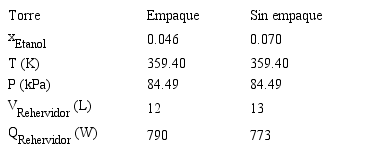 El rehervidor se llenó con 12 litros de una solución de etanol al 12 % w/w, se fijó una potencia en el rehervidor de 790 W mediante un balance de energía que se le realiza a la solución, la estabilidad de la torre se alcanza cuando la temperatura en el rehervidor es aproximadamente igual a la temperatura de la salida de la torre, la torre se operó a presión atmosférica y sin reflujo. Experimentalmente, en la TDD con el empaque se obtuvo el primer destilado después de 6 min de operación, mientras que con el empaque se obtuvo a los 8 min.