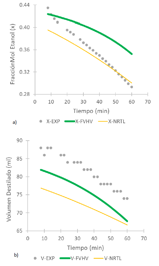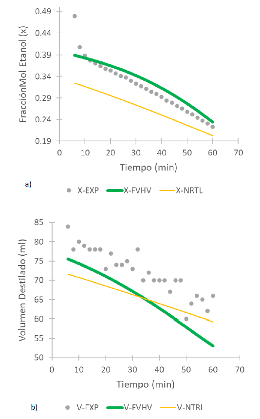 En el caso de los resultados obtenidos para el proceso de destilación discontinua, experimentalmente se observó que la primera porción del destilado es la más rica en la sustancia más volátil, tanto para la torre sin y con empaque. En las Fig. 8 y Fig. 9 se puede observar que las simulaciones de ambas torres, con ambos modelos, presentaban tendencias similares. Al simular la fracción molar de etanol en la torre sin empaque, los valores simulados obtenidos por el modelo NRTL presentaron un mejor ajuste que el modelo FVHV, sin embargo, en el caso de la torre empacada se observó un mejor ajuste con el modelo FVHV. Esto concuerda con los valores de AADX y AADV presentados en la Tabla 7.