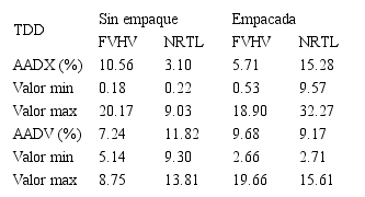 En el caso de la fracción molar se puede decir que el modelo NRTL tiene un mejor ajuste para la torre sin empaque, mientras que el FVHV se ajusta mejor para la torre empacada. En el caso del volumen de destilado, no se observa un buen ajuste con los dos modelos, aunque los valores simulados a los experimentales se acercan más para la torre empacada. En la Tabla 7 se presentan el porcentaje de la desviación absoluta promedio para el volumen (AADV) y para la concentración (AADX) de la TDD con la EoS y el modelo NRTL, respectivamente, para la torre sin y con empaque. Los errores obtenidos son relativamente considerables ya que superan el 5 %.