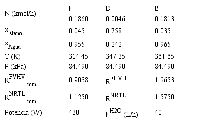 A partir de los métodos matemáticos previamente mencionados se encontraron las demás variables involucradas en el proceso de destilación como: potencia en el rehervidor, flujo de agua en el condensador, flujo de destilado (D), flujo de colas (B) y relación de reflujo (R). En la Tabla 3 se resumen las condiciones a las cuales se realizó la simulación para el método gráfico con la ecuación de estado y el modelo de actividad, respectivamente.