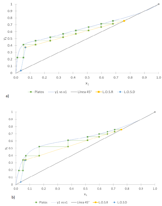 Como se observa en la Fig. 6 la relación de reflujo mínima en ambos casos está dada por corte y no por tangencia y la relación de reflujo se definió como 1.4 veces el Rmin. Los platos teóricos calculados son nueve tanto para la ecuación de estado como para el modelo de actividad. Entre la línea de operación para la sección de rectificación (L.O.S.R.) y la línea de operación para la sección de despojo (L.O.S.D) se puede encontrar el plato de alimentación óptimo que en este caso sería el plato ocho para ambos casos dado que la alimentación está poco concentrada en etanol.